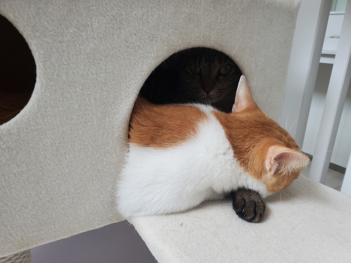 しゃけちゃん、前の日の夜 久しぶりに「うめのとこいくー」ってにゃーにゃー言ってたので、兄弟の〈うめまろ〉のいる寝室へ。そのまま一緒に寝る流れに。